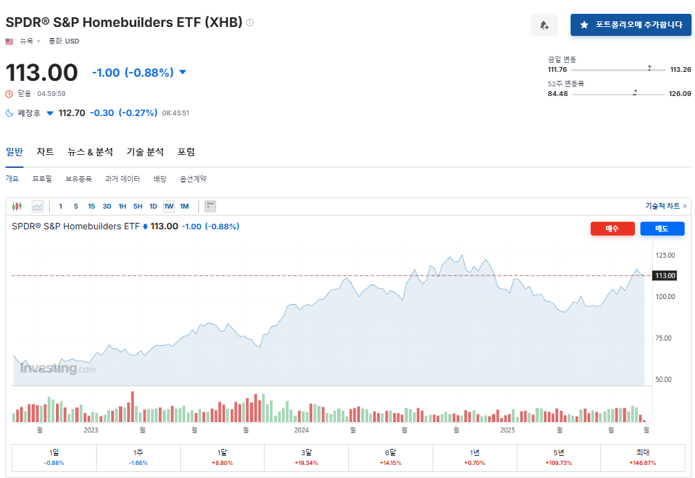 XHB (SPDR S&P Homebuilders ETF): 주택 건설업체뿐만 아니라 관련 자재, 설비 기업까지 폭넓게 포함하는 ETF